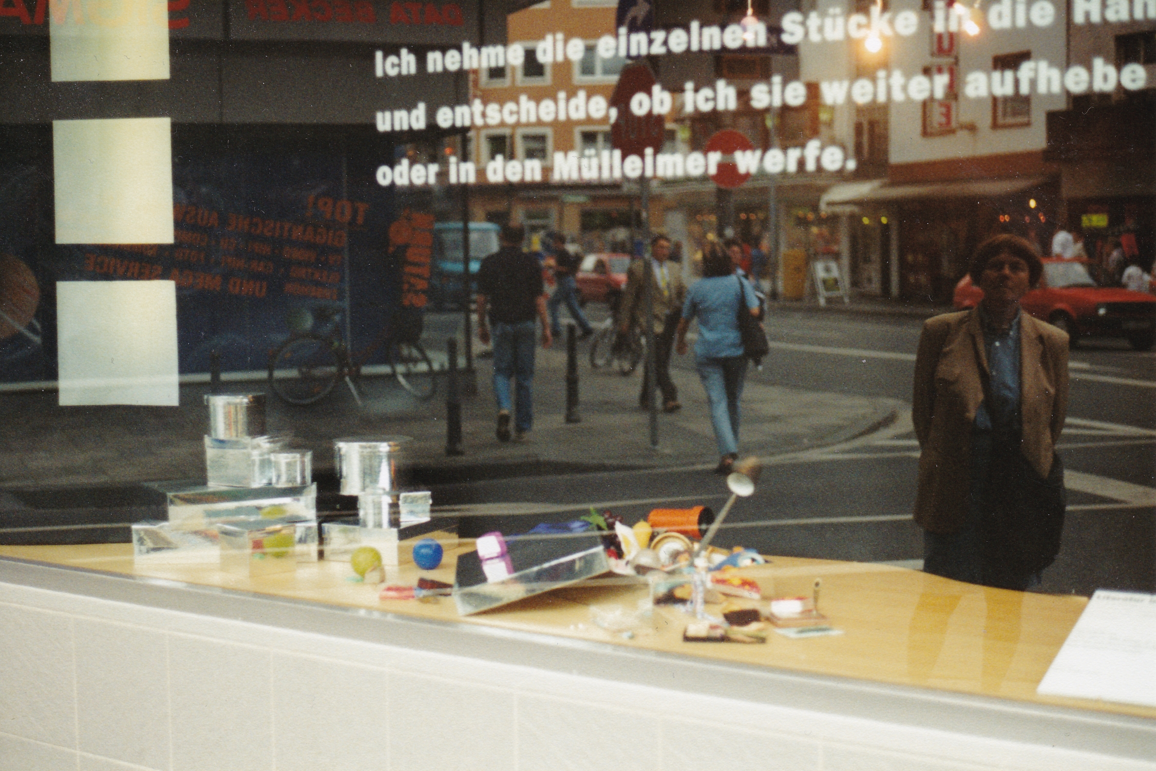 Schaufenster des Geschäftes "Lerch", Mainz, Sommer 1997. Die Autorin spiegelt sich rechts vorne im Glas.
